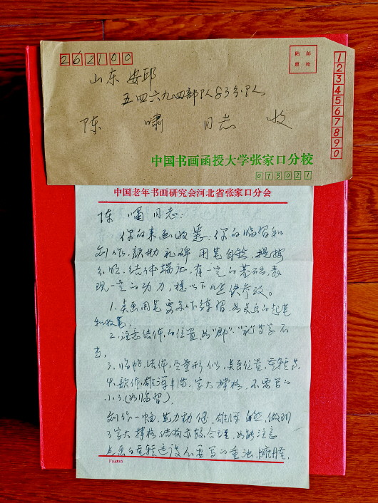 趁着疫情在家,我整理过去的书报资料,一个信封引起了我的注意,信封上写着:山东安邱五四六九四部队83分队,陈啸同志收。打开一看,是父亲写给陈啸同志的信和几幅书法作品。此时,我猛然想起,二十多年前,我在山东工作,过春节回家,父亲将一封信交给我,让我寄给或亲手转给部队的一位同志。在交谈中得知,是部队的这位同志写信与父亲交流书法心得,请父亲给予指教,父亲写了回信,还附了自己的一幅作品赠送给他。不承想,不知什么原因,我这个承办人竟没能把这封信寄送出去,这真是天大的遗憾!当然,要向陈啸同志说:“对不起了!”