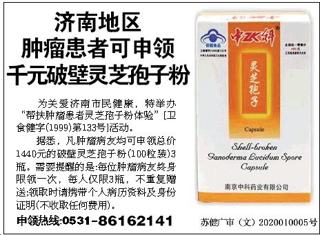 济南地区 肿瘤患者可申领 千元破壁灵芝孢子粉 为关爱济南市民健康,特举办“帮扶肿瘤患者灵芝孢子粉体验”[卫食健字(1999)第133号]活动。 据悉,凡肿瘤病友均可申领总价1440元的破壁灵芝孢子粉(100粒装)3瓶。需要提醒的是:每位肿瘤病友终身限领一次,每人仅限3瓶,不重复赠送;领取时请携带个人病历资料及身份证明(不收取任何费用)。 申领热线:0531-86162141