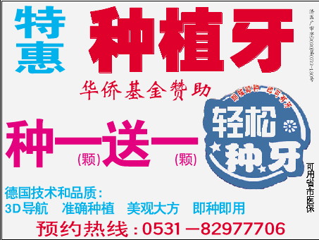 种植牙 预约热线:0531-82977706 可用省市医保 济医广审字[2020]第0722-130号 特 惠 华侨基金赞助 种一送一 德国技术和品质: 3D导航 准确种植 美观大方 即种即用 (颗) (颗)