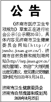 公 告 《济南市医疗卫生专项规划》草案正在进行社会公示(公示期30日),具体内容见济南市卫生健康委员会网站(http://jnmhc.jinan.gov.cn/)、济南市自然资源和规划局网站(http://nrp.jinan.gov.cn/规划管理)。欢迎广大市民提出意见建议,意见建议受理截至时间为2020年9月24日。 济南市卫生健康委员会 济南市自然资源和规划局 2020年8月25日