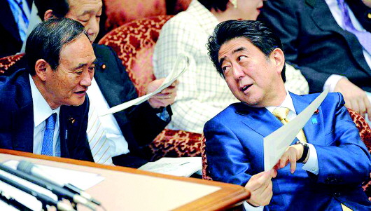 安倍晋三和菅义伟(左)在日本国会会议期间交谈。(资料片)
