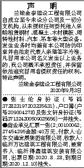 兰陵金泰建设工程有限公司自成立至今未设分公司及一切分支机构,从未授权任何委托他人采购租赁钢材、混凝土、木材模板、周转性材料、汽车、吊车等大型设备。发生业务时均盖有本公司防伪印章并由法定代表人亲笔签字为准,凡冒用本公司名义发生以上业务的,我公司概不承担责任,并保留依法追究冒用者侵权责任的权利。特此声明。