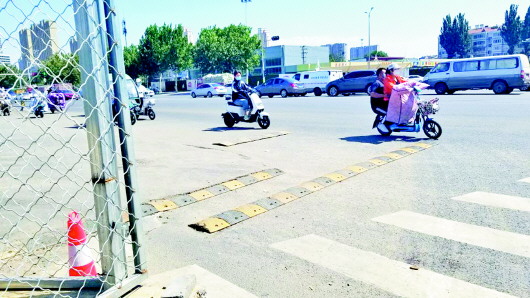9月2日,记者来到位于张庄路和经十路路口北侧的非机动车道,由于该处经十路北侧正在进行施工,只保留了宽约两米的非机动车道,百米多的车道上,从东往西设了三组减速带,最西侧一组是三道,东侧两组各两道,两道减速带之间距离大的有半米,小的有三四十厘米,有两道减速带只剩了半截。