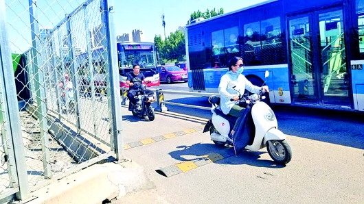▲来往市民绕着减速带骑车,都到了机动车道上,机非混行存在一定安全隐患。