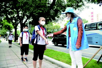 文登区第二实验小学严格落实常态化疫情防控措施,坚决筑牢校园安全防线,为广大师生营造健康安全的环境。开学第一天,值班教师在为学生进行晨检。