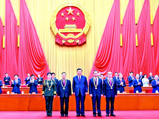 中共中央总书记、国家主席、中央军委主席习近平向“共和国勋章”获得者钟南山(前排右二),“人民英雄”国家荣誉称号获得者张伯礼(前排左二)、张定宇(前排右一)、陈薇(前排左一)颁授勋章奖章。 新华社发