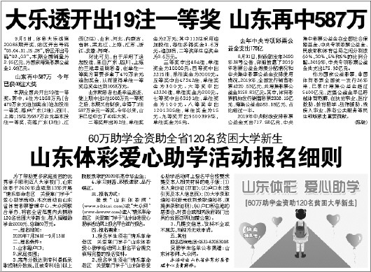 60万助学金资助全省120名贫困大学新生 山东体彩爱心助学活动报名细则   为了帮助更多家庭贫困的优秀学子顺利迈入大学校门,山东体彩于2020年连续第13年开展“情系革命老区 关爱寒门学子”爱心助学活动。本次活动由山东省体育彩票管理中心、大众网联合举办,将在全省范围内共捐助120名贫困大学新生,每人捐赠助学金5000元,总额60万元。   一、报名时间:   2020年7月24日—9月13日   二、报名条件:   1、山东籍户口;   2、家庭贫困;   3、高考分数达到专科最低录取控制分数线,且被专科(含)以上院校录取的2020年高中毕业生;   4、学习刻苦、积极进取、品行端正。   三、报名方式:   登录“山东体彩网”(www.sdticai.com)或“大众网”(www.dzwww.com)进入“情系革命老区 关爱寒门学子”山东体彩爱心助学活动网上报名平台进行报名。   四、报名要求:   1、报名学生须在“情系革命老区 关爱寒门学子”山东体彩爱心助学活动网上报名平台提交填写完整的报名资料。   2、报名学生须在“情系革命老区 关爱寒门学子”山东体彩爱心助学活动网上报名平台按要求提交本人相关材料的电子版:(1)本人身份证(双面);(2)户口本(索引页及本人信息页);(3)大学录取通知书(若未收到录取通知书,须提供录取证明);(4)户口所在地的居委会、村委会或相关政府部门出具的贫困证明(加盖公章)。   3、凡提交信息、资料不全或不属实,均视为无效申请。   五、其他   报名咨询电话:0531-82053018   受助学生名单公布渠道:山东体彩网、大众网。   本活动由山东省体育彩票管理中心负责解释。 大乐透开出19注一等奖 山东再中587万   9月5日,体彩大乐透第20085期开奖,前区开出号码“03、04、11、15、28”,后区开出号码“02、03”。本期全国销量为2.95亿元,为国家筹集彩票公益金1.06亿元。      山东再中587万 今年已获40注大奖   本期全国共开出19注一等奖。其中,4注为1058万元(含470万余元追加奖金)追加投注一等奖,落户广东(2注)、四川、上海;15注为587万余元基本投注一等奖,花落广东(3注)、江西(2注)、山东、河北、内蒙古、吉林、黑龙江、上海、江苏、浙江、安徽、河南。   对比可见,由于采用了追加投注,来自广东、四川、上海的三地幸运购彩者,在单注一等奖方面要多拿了470万余元追加奖金,从而使得单注一等奖总奖金达到1058万元。   山东购彩者也是幸运连连,继上期中出1注1000万元一等奖之后,本期又有斩获,中得了1注587万余元一等奖。今年以来,山东已经中出了40注大奖。   二等奖开出392注,单注奖金为2万元;其中112注采用追加投注,每注多得奖金1.6万元。追加后,二等奖单注总奖金为3.6万元。   三等奖中出484注,单注奖金为10000元。四等奖中出2215注,单注奖金为3000元。五等奖中出47242注,单注奖金为300元。六等奖中出42320注,单注奖金为200元。七等奖中出63191注,单注奖金为100元。八等奖中出1201305注,单注奖金为15元。九等奖开出9500399注,单注奖金为5元。      去年中央专项彩票公益金支出175亿   8月31日,财政部发布2020年38号公告,详细披露了2019年彩票公益金筹集分配情况和中央集中彩票公益金安排使用情况。2019年,全国发行销售彩票4220.53亿元,共筹集彩票公益金1158.81亿元。其中,体育彩票机构发行销售彩票2308.15亿元,筹集公益金583.18亿元,占比超过一半。   2019年中央财政安排彩票公益金支出717.58亿元,中央集中彩票公益金在全国社会保障基金、中央专项彩票公益金、民政部和体育总局之间分别按60%、30%、5%和5%的比例分配。2019年,中央专项彩票公益金共支出175.92亿元。   作为国家公益彩票,中国体育彩票全国统一发行26年来,已累计筹集公益金超过5400亿元,这些公益金早已跨越体育范畴,在扶贫事业、医疗救助、教育助学、法律援助、残疾人事业、养老公共服务等民生领域做出重要贡献。   (陈敏)