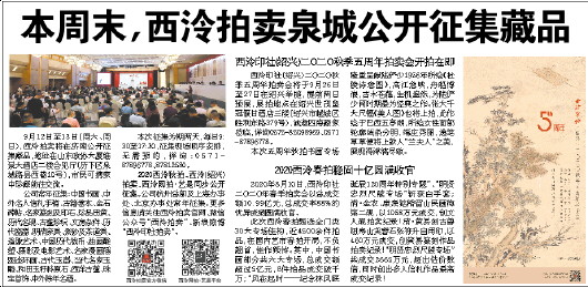 西泠印社(绍兴)二O二O秋季五周年拍卖会开拍在即   西泠印社(绍兴)二O二O秋季五周年拍卖会将于9月26日至27日在绍兴举槌,提前两日预展,展拍地点在绍兴世茂皇冠假日酒店三楼(绍兴市越城区胜利东路379号),诚邀四海藏家莅临,详询0575-85098969、0571-87896778。   本次五周年秋拍书画专场隆重呈献陆俨少1956年所绘《杜陵诗意图》,高江急峡,舟船博浪,古木苍藤,生机盎然,为陆俨少同时期最为经典之作。张大千大尺幅《美人图》也将上拍,此作绘于巴西五亭湖,所绘女性面部轮廓线条分明,端庄秀丽,逸笔草草便将上款人“兰夫人”之美,展现得淋漓尽致。 2020西泠春拍稳固十亿圆满收官   2020年8月10日,西泠印社二O二O年春季拍卖会以总成交额10.99亿元,总成交率88%的优异成绩圆满收官。   此次西泠春拍甄选全门类30大专场佳构,近4500余件拍品,在国内艺市春拍开局,不负翘首,佳作频传。其中,中国书画部分共六大专场,总成交额超过5亿元,8件拍品成交破千万;“风在起时——纪念林风眠诞辰120周年特别专题”、“明贤忠烈尺牍专场”斩获白手套;清·金农、康焘铭稽留山民画梅第二砚,以1058万元成交,创文人砚拍卖纪录!清·黄易刻古兽钮寿山芙蓉石张符升自用印,以460万元成交,创黄易篆刻作品拍卖纪录!“明贤忠烈尺牍专场”共成交2665万元,超出估价数倍,同时创出多人信札作品最高成交纪录! 本周末,西泠拍卖泉城公开征集藏品   9月12日至13日(周六、周日),西泠拍卖将在济南公开征集藏品,地址在山东政协大厦维景大酒店二楼会见厅(历下区泉城路县西巷10号),市民可携家中珍藏前往交流。   公司常年征集:中国书画、中外名人信札手稿、古籍善本、金石碑帖、名家篆刻及印石、珍品田黄、历代名砚、古董珍玩、文房杂件、历代瓷器、明清家具、紫砂及茶道具、造像艺术、中国历代钱币、油画雕塑、摄影及电影艺术、名家漫画插图连环画、古代玉器、当代名家玉雕、和田玉籽料原石、西洋古董、珠宝首饰、中外陈年名酒。   本次征集为期两天,每日9:30至17:30,征集现场顺序安排,无需预约,详询:0571-87896778、87812580。   2020西泠秋拍、西泠(绍兴)拍卖、西泠网拍·艺是同步公开征集。公司杭州总部及上海办事处、北京办事处常年征集。更多信息请关注西泠拍卖官网、微信公众号“西泠拍卖”、新浪微博“西泠印社拍卖”。   西泠拍卖官方微信   西泠网拍·艺是平台