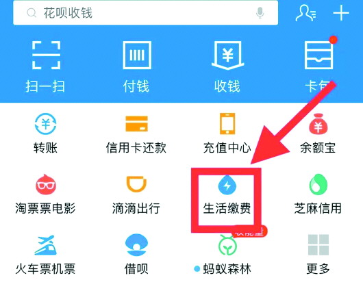 第一步:打开支付宝首页,点击“生活缴费”