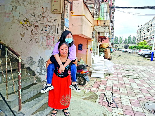 9月12日,妈妈背着邹怡芳下楼准备坐上青岛大学的专车去报到。