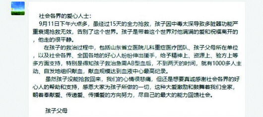 孩子的父母在处理完后事之后写了一段话,感谢社会各界爱心人士的无私援助,“虽然孩子没能抢救回来,我们的心情很悲痛,但还是想要真诚感谢社会各界好心人的帮助和支持,感恩大家为孩子所做的一切,这种大爱激励和鼓舞着我们全家,朝着奉献爱、传递爱、传播爱的方向努力,尽自己最大的能力回馈社会。”
