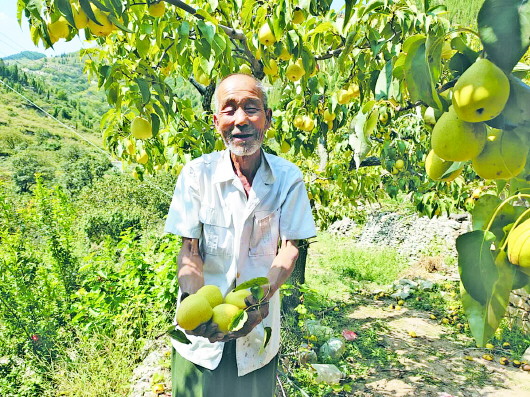 今年81岁的董云富老人正在梨园采摘熟透的黄梨。董云富的梨园内有40多棵梨树,其中百年以上的老梨树就有十几棵。看到一个个黄梨挂满枝头,董云富笑得合不拢嘴。