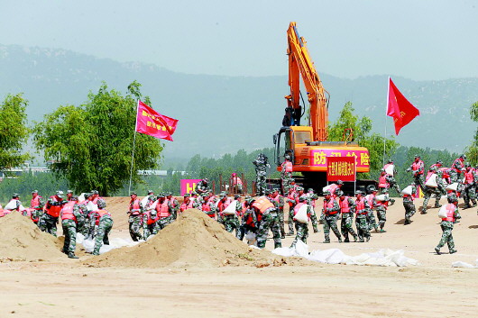 2020年,国家防总山东省防指防汛抢险联合应急演练现场,救援队伍正在进行实战演练。