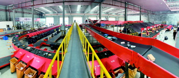 这些大小不一的车辆多数聚集在园区内一个叫做“共同配送中心”的厂房四周。面积5600余平米的厂房内,一个橙色的庞大机器“坐镇”其间,机器四沿的履带不停旋转,履带上一件件快递包裹到达自己要去的“站点”时自动下站,滑入打包袋中。机器四周安装着可伸缩的“手臂”,能直接伸进快递货车内,通过传送履带将快递包裹陆续运送至机器作业面。