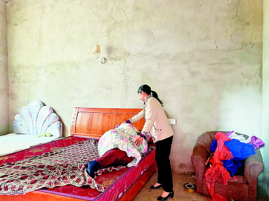 给丈夫张国武翻过身、擦洗完,舒爱兰从灰暗的房间里走出来,拉过一个塑料凳子在记者面前坐下。