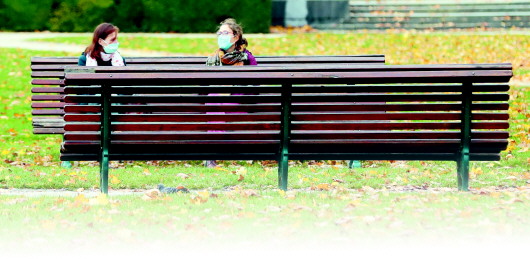 10月30日,在比利时布鲁塞尔,两名女子坐在长椅上交谈。