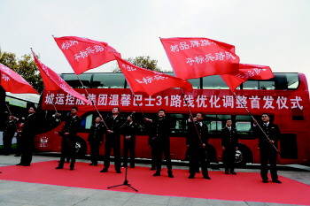 10月29日,青岛城运控股集团温馨巴士31路优化调整首发仪式在天泰体育场公交场站举行,31路以“温馨号”为命名进行全新亮相,这是青岛城运控股集团成立后首条在车体形象、运营线路、运力搭配上实施的优化、提速和升级的线路。新上线的“温馨号”将走新线、穿新装、加新车,在10月30齐正式上路运行。“温馨号”打破传统公交车配置标准,从线路、车型、服务、安全的各个方面进行了升级、完善,最大限度让车厢更舒适、出行更省时、换乘更便捷。