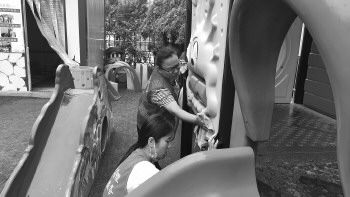 身穿志愿者马甲的张新燕在清洁小区里的滑梯。