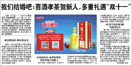 在众多新人领证的同时,也有不少后浪依旧为单身或未婚而烦恼着,藉此,在双十一前夕,泸州老窖六年窖头曲携本报在新媒体网络上发起了一场以“我们结婚吧·前浪攻略”为主题的双十一互动话题征集活动,互动一经发出,便引起了“前浪们”的广泛讨论和热烈参与,纷纷为“后浪”建言献策,给他们献上实用攻略的同时,也带去了美好祝愿。