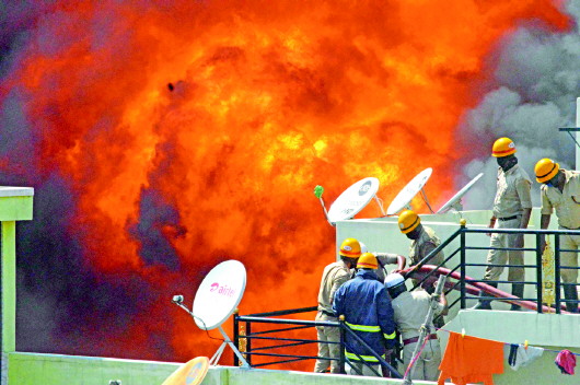 11月10日,消防人员在印度班加罗尔一处化工厂灭火。当日,印度班加罗尔一个化工厂发生火灾。 新华
