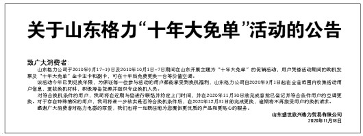 关于山东格力“十年大免单”活动的公告