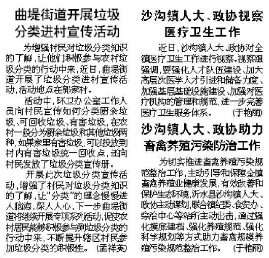 开展此次垃圾分类宣传活动,增强了村民对垃圾分类知识的了解,让“分类”的理念慢慢进入脑海,深入人心,下一步曲堤街道将继续开展专项系列活动,促使农村居民能够积极参与到垃圾分类的行动中来,不断提升辖区村民参加垃圾分类的积极性。 (孟祥英)