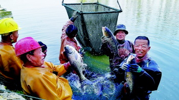 本报德州11月17日讯(记者王金刚 孙文丽 通讯员 庞占英) “今年大丰收,这茬鱼又大又肥,赶上最近行情特别好,一斤多能多卖几毛钱很正常。”11月11日,齐鲁晚报·齐鲁壹点记者来到禹城市安仁镇齐庄村,正值村民齐今平开塘捕鱼,现场让人眼前一亮:渔网沿边捞起,鱼儿欢腾跳跃,数十名工人一手拉网一手捡鱼,不一会儿满满一兜被吊起,装进客商的车辆中……“这次是济南来的顾客,数千斤的鲜鱼,最快今晚就能出现在餐桌上。”齐今平一边记账一边招呼着,忙得不亦乐乎。
