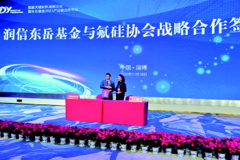 随着视频连线接通,嘉宾共同感受了东岳未来氢能生产现场的震撼场景。与会领导走上启动台,共同见证“东岳150万平米质子交换膜生产线一期工程投产启动”的历史时刻。随后,会上举行了润信东岳基金与氟硅协会的战略合作签约仪式。