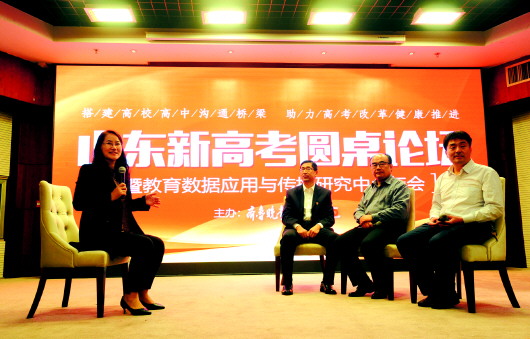 在11月22日下午举办的山东新高考圆桌论坛上,山东大学本科生院院长、本科招生办公室主任刘传勇(右二)与历城二中副校长岳善华(右三)、山东师范大学附属中学校长助理王彬(右一)齐聚一堂,共同探讨新高考下的大学招生新模式。 齐鲁晚报·齐鲁壹点记者 戴伟 摄