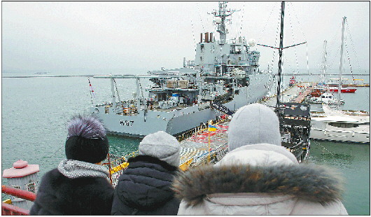 ◥2018年12月21日,在乌克兰港口城市敖德萨,人们观看一艘英国皇家海军舰船。英国皇家海军小组将对乌海军开展培训工作。 新华社发