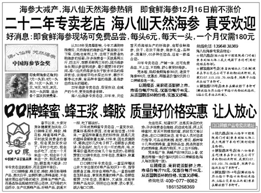 凭本版,购即食鲜海参300元,老淡干海参800元,优惠后,再赠送价值22元的口口牌蜂胶皂一块。