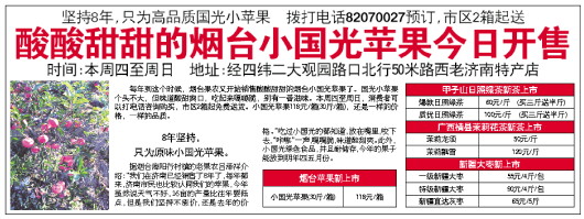 据烟台海阳行村镇的老果农吕泽祥介绍:“我们在济南已经销售了8年了,每年都来,济南市民也比较认同我们的苹果,今年虽然说天气不好,16亩的产量比往年要低点,但是我们坚持不涨价,还是去年的价格。”吃过小国光的都知道,放在嘴里咬下去“咔嚓”一声嘎嘎脆味道酸甜爽。此外,小国光绿色食品,并且耐储存今年的果子能放到明年四五月份。