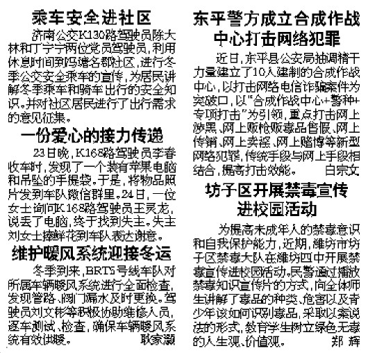 济南公交K130路驾驶员陈大林和丁宁宁两位党员驾驶员,利用休息时间到冯塘名郡社区,进行冬季公交安全乘车的宣传,为居民讲解冬季乘车和骑车出行的安全知识。并对社区居民进行了出行需求的意见征集。