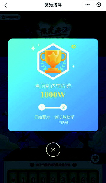 在上线后不到一个月的时间里,“微光海洋”公益平台互动火热。截止目前,已征集2400余个公益梦想,十大热门公益活动推荐收获百万点赞、几十万条评论留言,平台总爱心值累计已突破1000W+。而在每位公众的拳拳爱心支持下,数据热度还在不断攀升。所有汇聚的爱心力量让公益体彩的爱心之路被肯定,也让“中国体育彩票·新长城助学基金”能继续惠及更多寒门学子。