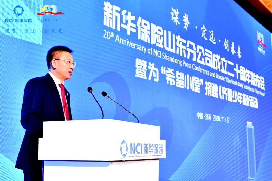 11月27日,新华保险山东分公司在济南举行成立二十周年发布会暨为“希望小屋”捐赠《齐鲁少年报》活动。共青团山东省委副书记刘少华参加活动并讲话,新华保险山东分公司党委书记、总经理刘崇松代表公司致欢迎辞。活动现场,山东青年报刊传媒中心主任程凯和新华保险山东分公司党委副书记、副总经理张俊国向全省5000个“希望小屋”捐赠了价值30万元的《齐鲁少年报》。