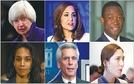 上排从左至右:获提名担任财长的耶伦、获提名担任白宫行政管理和预算局局长的坦登和获提名担任副财长的阿德耶莫。 下排从左至右:获提名担任白宫经济顾问委员会主席的劳斯、被任命为白宫经济顾问委员会成员的伯恩斯坦和博希。