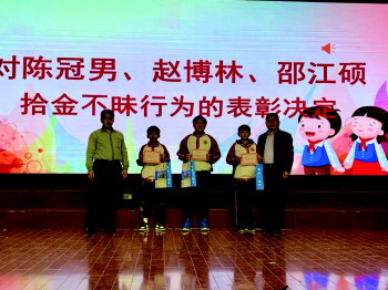 学校举行表彰大会,为三位拾金不昧的同学颁发了荣誉证书和奖品。