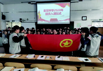 光荣入团 近日,皇冠中学于总校阶梯教室内举行2020年团员入团仪式。(万芷毓)