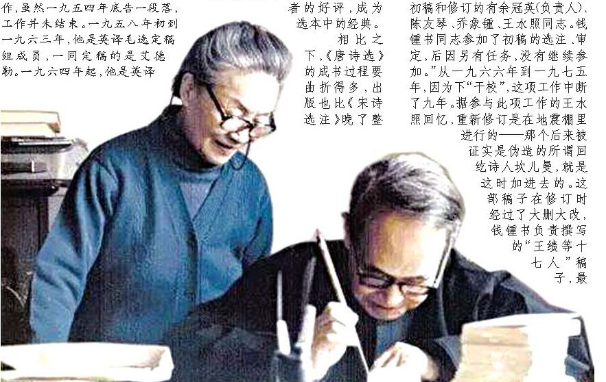 锺书在毛选翻译委员会的工作,虽然一九五四年底告一段落,工作并未结束。一九五八年初到一九六三年,他是英译毛选定稿组成员,一同定稿的是艾德勒。一九六四年起,他是英译毛主席诗词的小组成员。“文化大革命”打断了工作,一九七四年继续工作,直到毛主席诗词翻译完毕才全部结束。……锺书同时兼任所内的研究工作,例如参加古典组的《唐诗选注》。