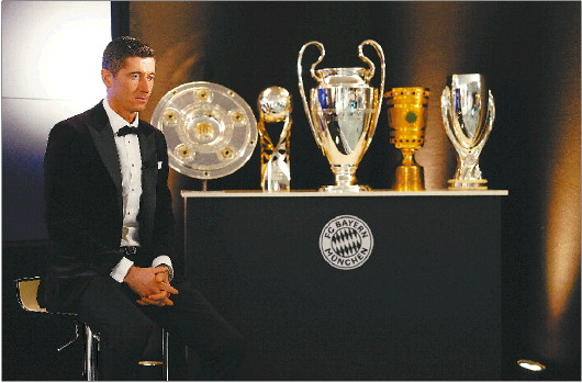 莱万展示自己的五冠王奖杯。IC photo