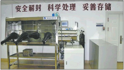 嫦娥五号月球样品“新家”——中科院国家天文台月球样品实验室的地外样品制备室门口,展示的样品处理样机。