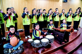 宁津县棠湖小学的孩子们用淘乐器演奏。