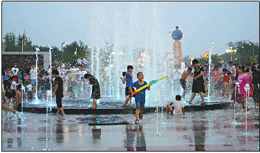 孩子们在音乐喷泉广场尽情玩耍。