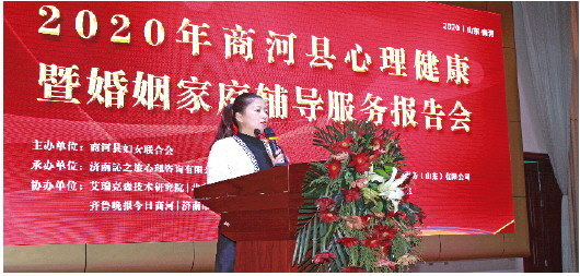 在2020年商河县心理健康暨婚姻家庭辅导服务报告会上,潘建平在分享自己的经验。