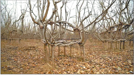 走进冬天的果树园,枯黄的树枝和大地仿佛融合在了一起,在被大片光秃秃的桃树包裹起来的一个小院子里,记者见到了十分有趣的一幕,一把把苍劲有力、浑然天成的“树椅”,一排排地“站”在哪里,整齐划一,骄傲且富有活力,这些就是张永朋马上就要“丰收”的90多把“树椅”。