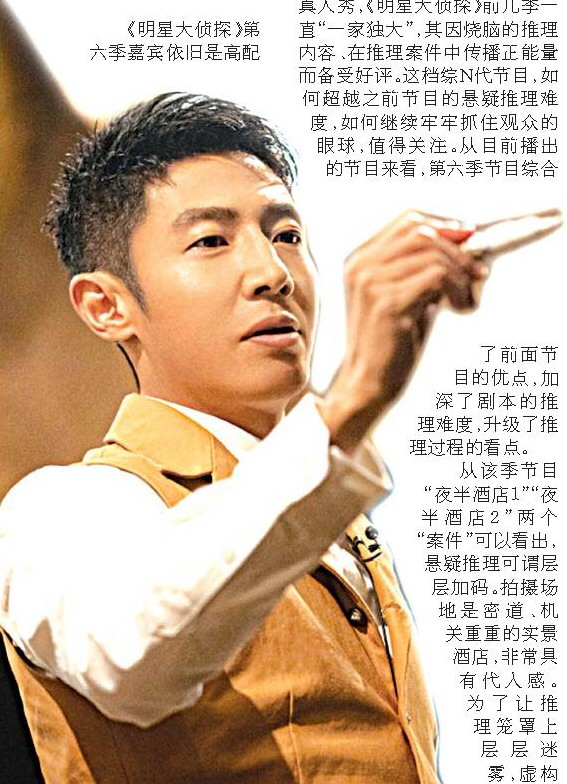 《明星大侦探》第六季嘉宾依旧是高配版,集合了撒贝宁、何炅、刘昊然、张若昀、白敬亭等明星,嘉宾自带流量,关注度高。节目做到第六季,能开播4期还保持9.1分的评分,实属难得。作为首档悬疑推理真人秀,《明星大侦探》前几季一直“一家独大”,其因烧脑的推理内容、在推理案件中传播正能量而备受好评。这档综N代节目,如何超越之前节目的悬疑推理难度,如何继续牢牢抓住观众的眼球,值得关注。从目前播出的节目来看,第六季节目综合了前面节目的优点,加深了剧本的推理难度,升级了推理过程的看点。