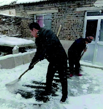 ◤图为文登区泽头镇纪委为贫困户清雪。