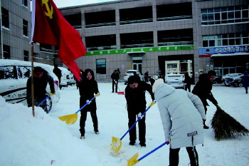 ▲图为文登区金山纪委纪检监察干部参加清雪工作。
