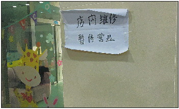 婴儿游泳馆门口的白纸上写着:“店内装修 暂停营业”。
