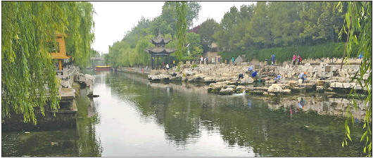 风景如画的济南护城河边,市民、游客沿步道赏景休闲。(资料片)